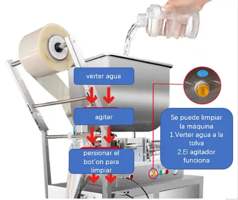 ● Botón de limpieza La limpieza de la envasadora de salsas es muy fácil, que simplemente usted vierta agua en la tolva, y la máquina trabajará a través del agitador encendiendo la envasadora de salsas y luego presione el botón de limpieza.。